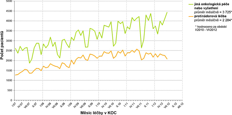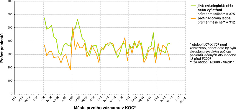 Hodnocení pracuje s datovým souborem popisujícím péči o pacienty se ZN prostaty v celkově 15 nemocnicích tvořících 11 KOC v období od ledna 2007 do prosince 2012. Celkem 42 115 pacientů bylo ve sledovaném období v těchto KOC léčeno (protinádorová léčba nebo dispenzarizace). Na obrázcích 1 a 2 jsou znázorněny časové trendy v incidenci a prevalenci pacientů léčených pro ZN prostaty (protinádorová léčba nebo jiná péče). Je patrné, že počty nově příchozích pacientů, kteří zahajují léčbu v síti KOC, jsou v čase relativně stabilní. Rostoucí prevalence léčených a především dispenzarizovaných potom odráží prodlužující se dobu přežití pacientů s touto diagnózou.