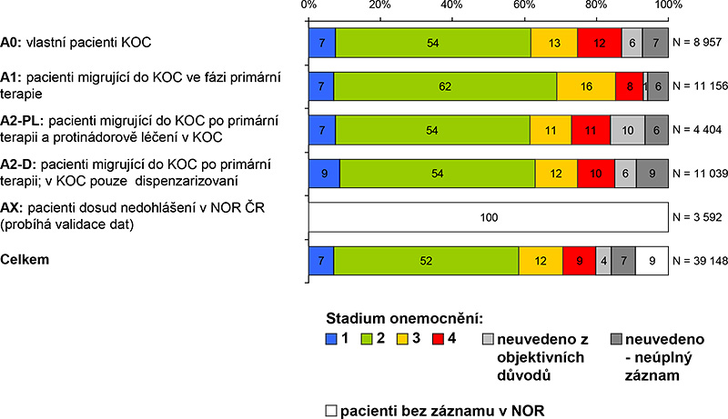 Přibližně 60 % pacientů v péči KOC v letech 2007–2011 bylo primárně léčeno pro ZN prostaty ve stadiu 1 nebo 2. Ve stadiu 3 bylo léčeno 12 % pacientů, v primárně metastatickém stadiu bylo léčeno 9 % pacientů. Migrace pacientů za léčbou v KOC je přibližně stejná pro různá primární klinická stadia, výjimkou jsou pouze pacienti migrující do KOC ve fázi primární terapie (A1), u kterých je znatelně vyšší zastoupení časných stadií (obrázek 3).